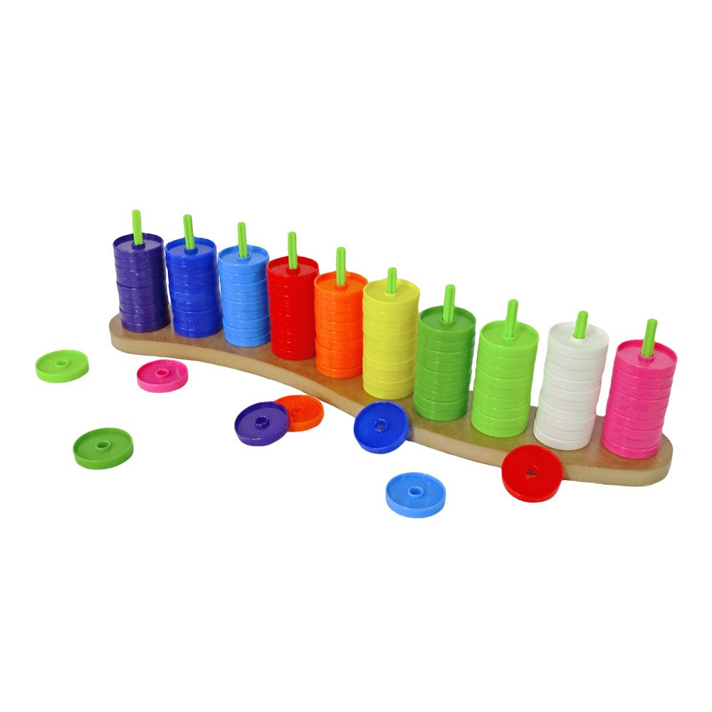 Descripción: Producto fabricado en madera MDF y plástico inyectado, compuesto por una base de madera con 10 ejes plásticos, cada uno contiene 10 discos plásticos de diferentes colores de 5 x 5 x 5 cm.