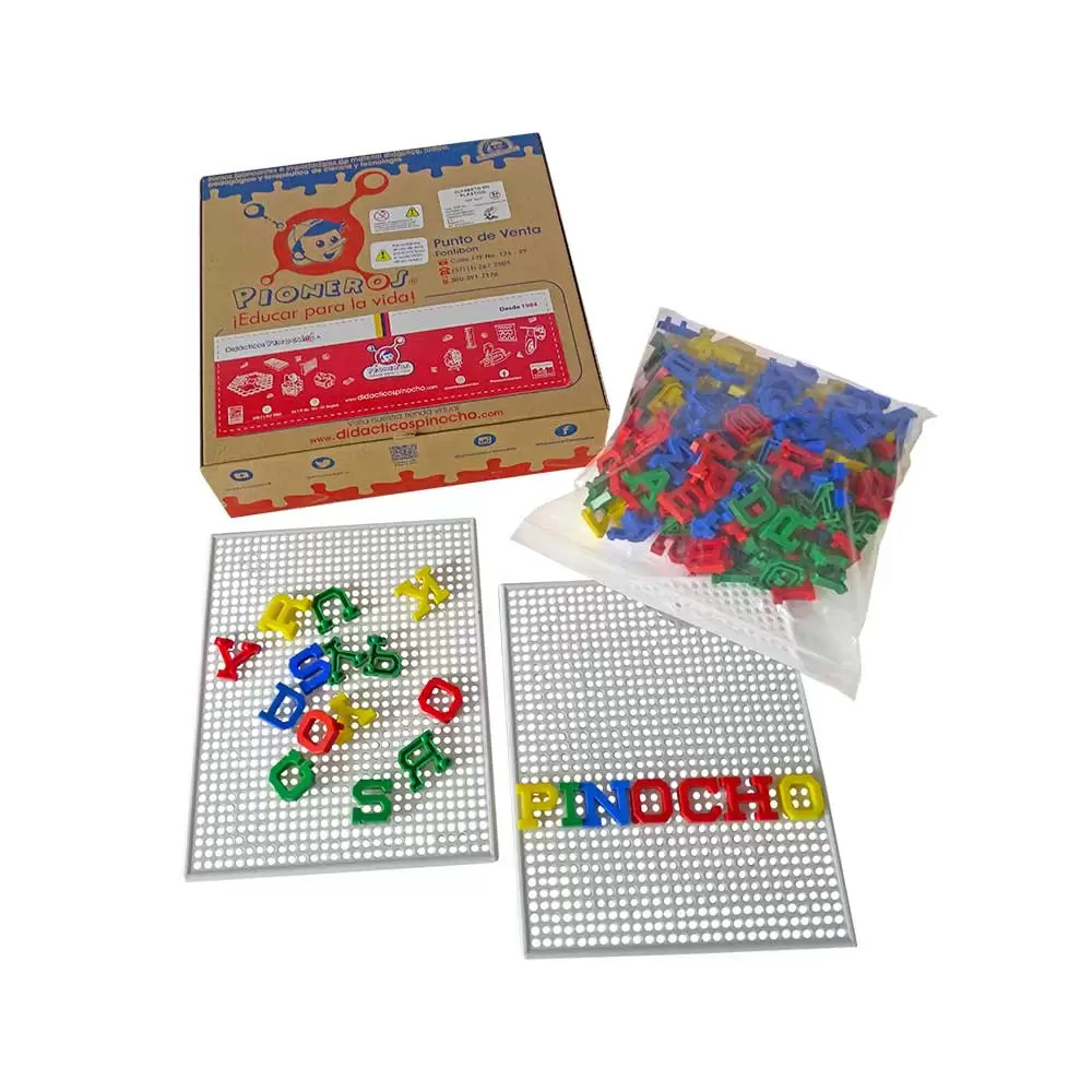 Descripción: Juego fabricado en plástico, compuesto por dos plantillas con retícula perforada para anclar las letras y 210 piezas entre vocales y consonantes de 2,5 x 1,2 x 1,2 cm (todas estas letras vienen en mayúscula). Cada letra trae un pin para poder ser anclada.