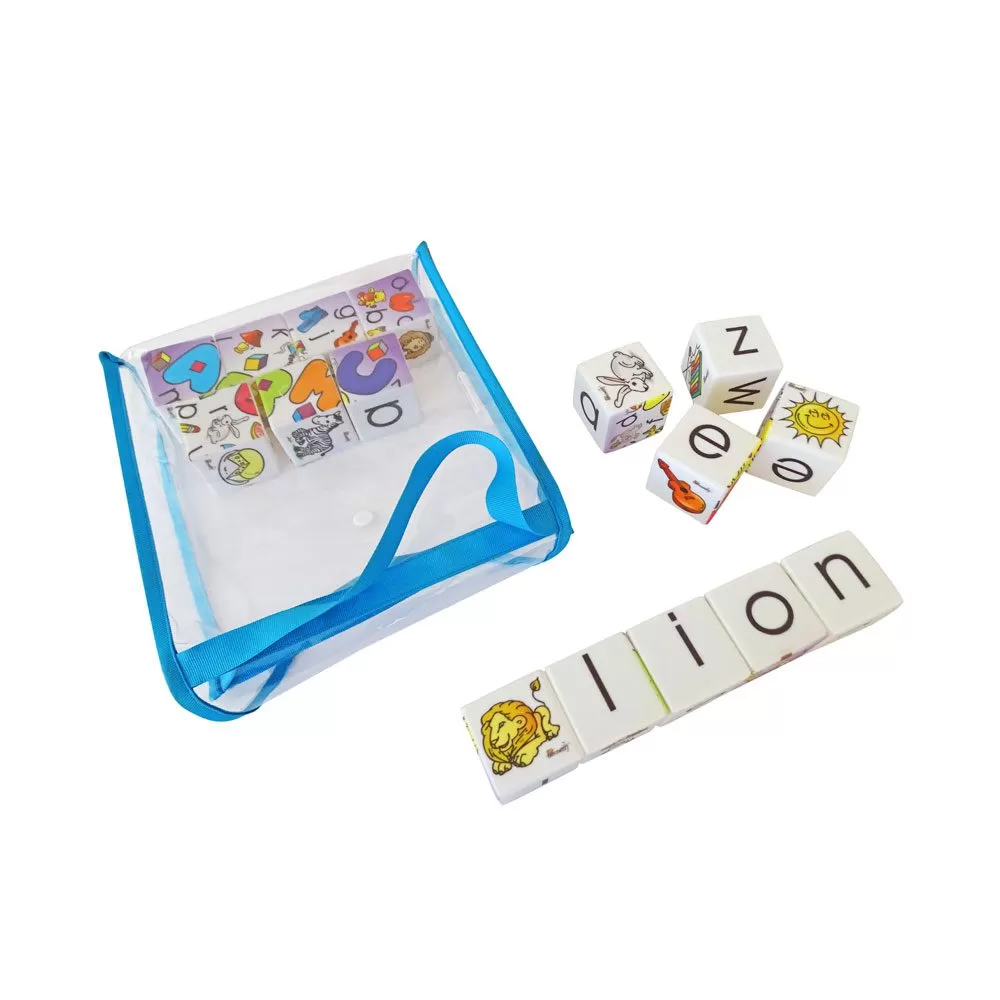 Descripción: Juego elaborado en poliestireno de alta resistencia y de diferentes colores. Compuesto de 16 cubos plásticos de (3.9×3.9×3.9 cm) con 32 ilustraciones, 48 letras y 1 cara de cada cubo con u segmento del rompecabezas del alfabeto. Su estuche es un bolso en plástico transparente resistente. Incluye instructivo. El material en el que esta elaborado, permite mantenerlo en condiciones higiénicas, no es tóxico y es amigable con el medio ambiente no solo por su durabilidad sino también por ser reciclable.