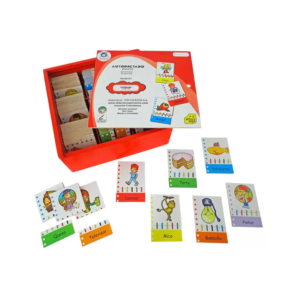 Descripción: Juego fabricado en madera MDF con impresión serigráfica en policromía a base de tintas UV no tóxicas, compuesto por 1 caja de madera que funciona como almacenamiento, 108 piezas divididas en dibujo y palabra; distribuidas en 6 temas, medios de transporte, verbos, alimentos, animales, objetos, oficios y profesiones.