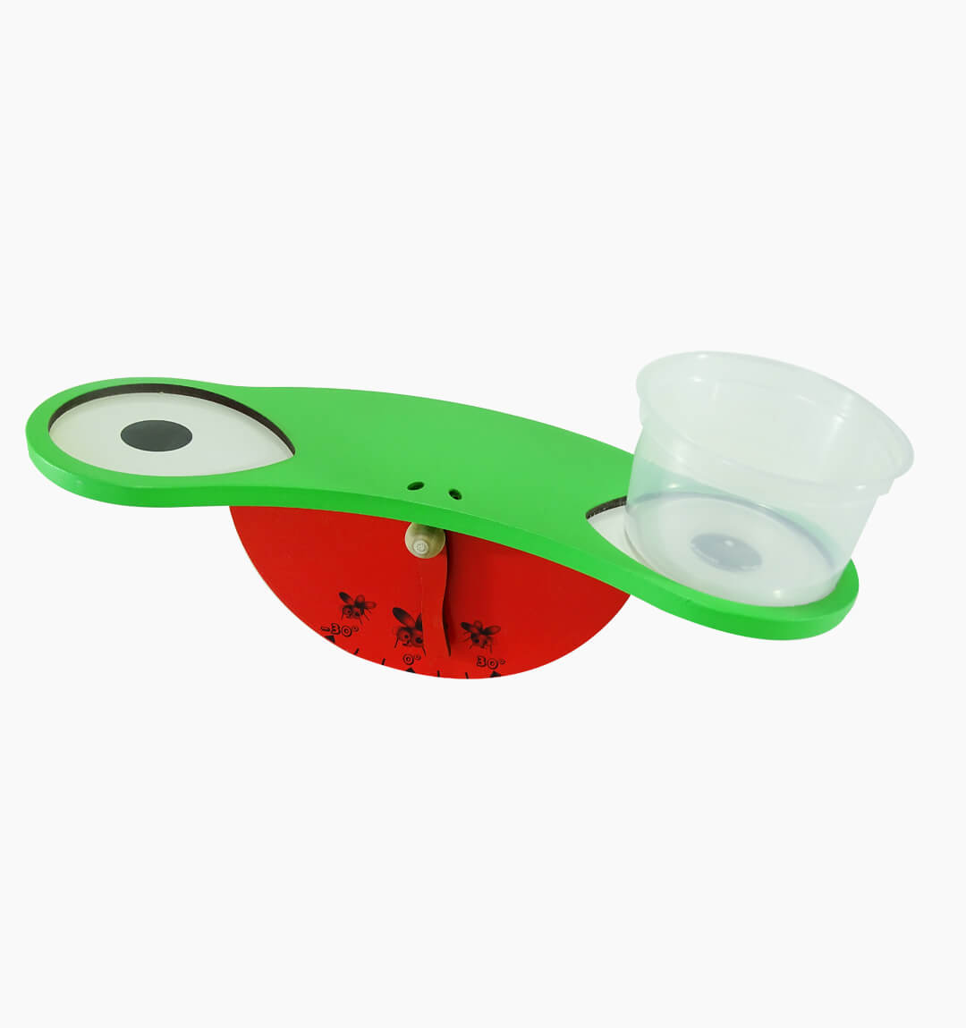 Descripción: Balanza elaborada en madera MDF con impresión serigráfica a base de tintas UV no tóxicas. Compuesta por una base y dos recipientes en plástico. Pintado de color rojo y verde. Instructivo descargable por código QR.