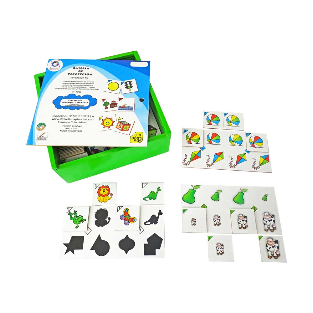 Descripción: Juego fabricado en madera MDF con impresión serigráfica en policromía a base de tintas UV no tóxicas, compuesto por 1 caja de madera que funciona como almacenamiento, 5 loterías (percepción de colores, percepción de formas, percepción tamaños, percepción fondo – figura y percepción relaciones espaciales). Cada lotería contiene 3 tableros de 21 x 10 x 0,3 cm y 24 fichas de 5 x 5 x 0,3 cm para un total de 135 piezas.