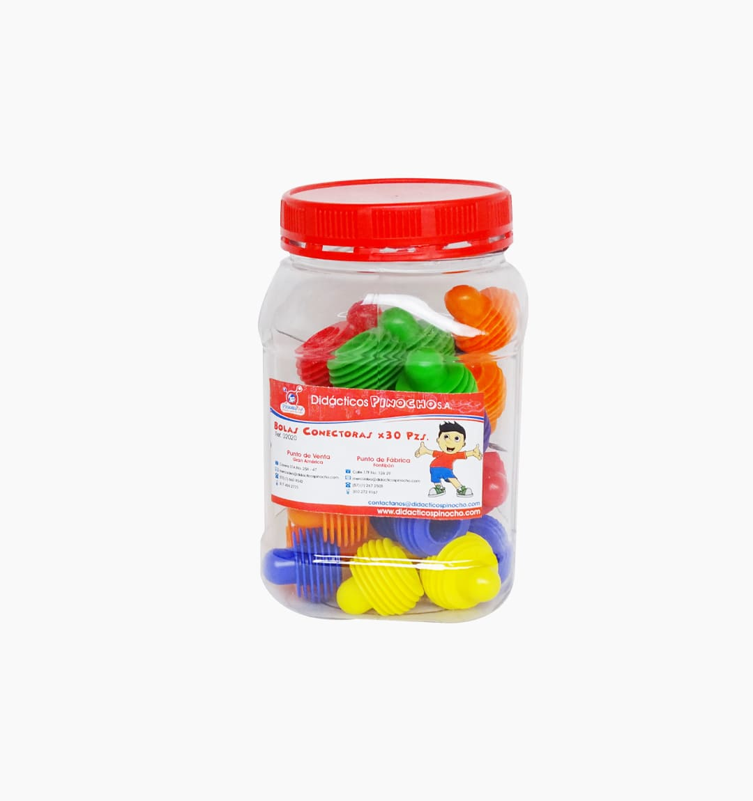 Descripción: Bolas conectoras elaboradas en plástico resistente de diferentes colores. Compuesto por 30 bolas las cuales tiene ranuras en todo su cuerpo para poder enlazar entre si. Adicionalmente, trae 4 tarjetas de seguimiento visual en maule plastificado. Instructivo descargable por codigo QR.