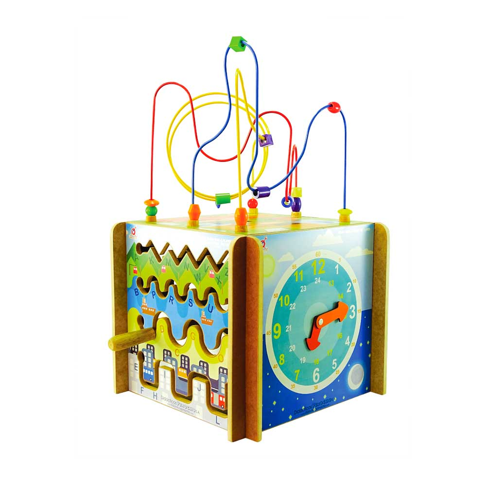 Descripción: Juego fabricado en madera MDF con impresión serigráfica en policromía a base de tintas UV no tóxicas. En cada cara hay un juego diferente: Reloj didáctico, Juego de encajar con 5 fichas de animales, Laberinto de complejidad consta de 3 varillas de alambre semiacerado y contienen en total 16 cuentas plásticas de diferentes formas y colores, patrón para preescritura con lápiz o guía en madera, patrón de secuencias con 24 pines y 6 tarjetas en madera impresas por ambas caras con diferentes retos.