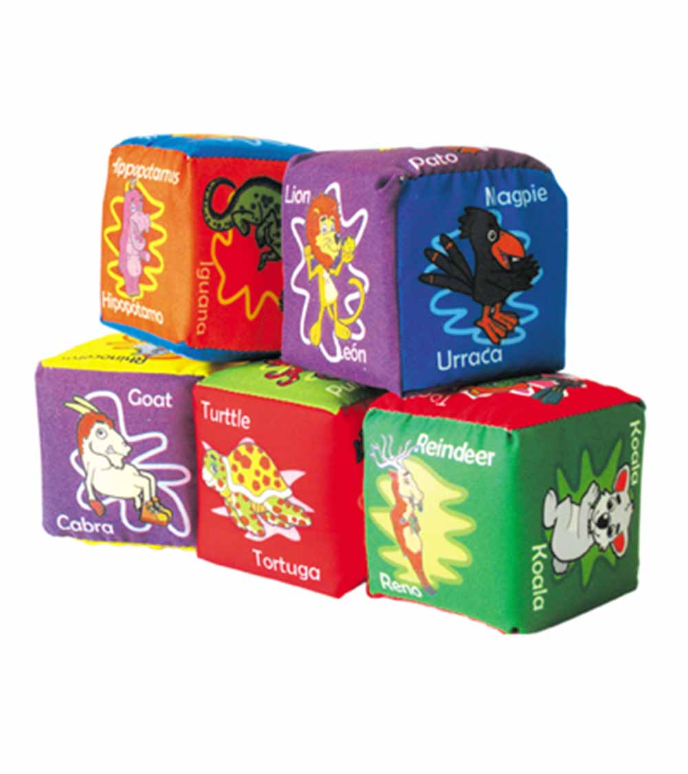 Descripción: Cubos de fauna elaborados en espuma y recubiertos en tela plástica de diferentes colores, impresos con diferentes animalitos con su nombre en español e inglés. Compuesto por 5 cubos con impresiones en cada una de sus caras con animales caricaturizados cada cubo es de 10x10x10 cm.