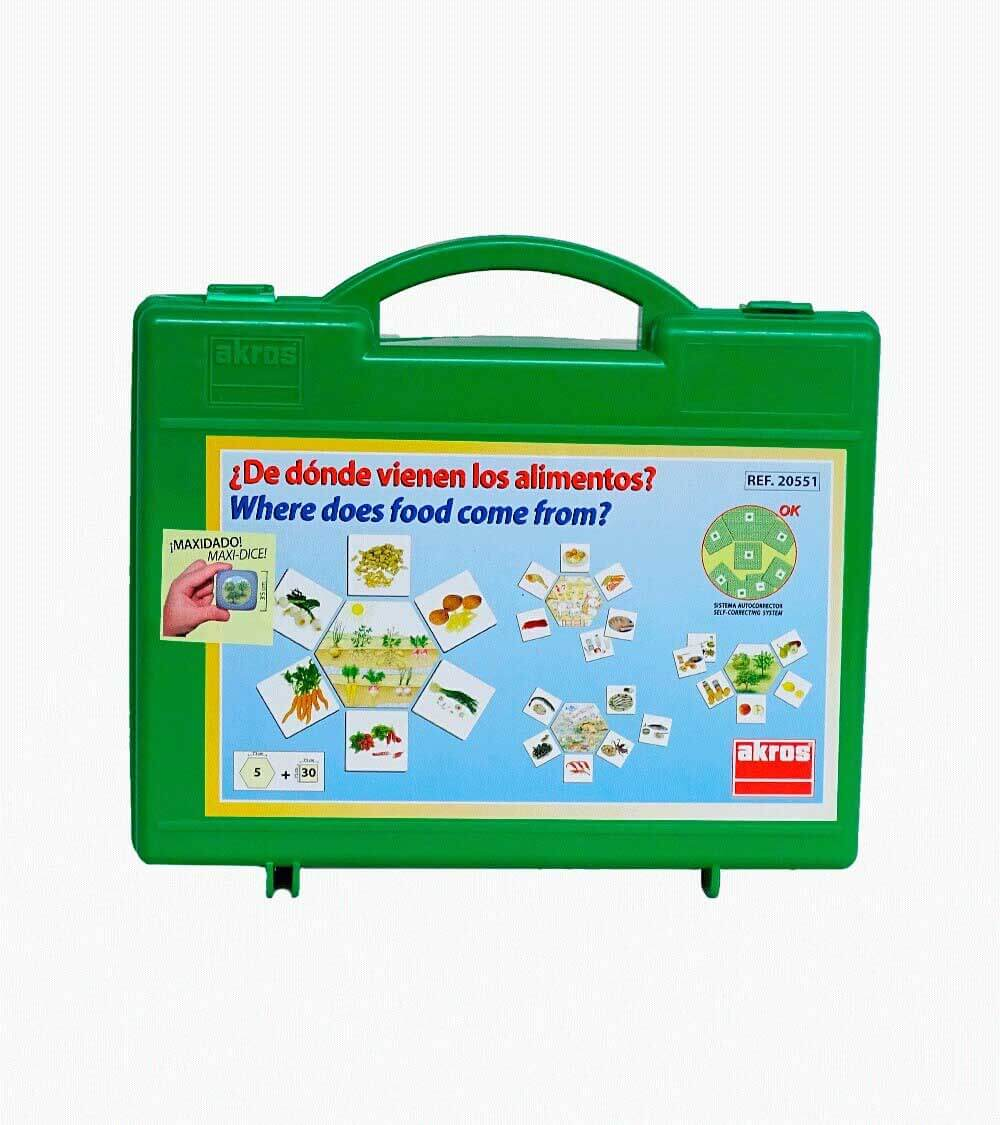 Descripción: Juego elaborado en cartón piedra de 2 mm con impresión en policromía y plástico resistente de diferentes colores. Compuesto por 5 fichas hexagonales de (13×13 cm) con el contexto de origen de los alimentos, 30 fichas de alimentos de (7.5×7.5 cm) y un dado de (3.5×3.5×3.5 cm). Las fichas contiene un sistema de auto-corrección para validar de forma inmediata si el ejercicio se realizó de forma correcta. Pueden jugar hasta 5 niños.