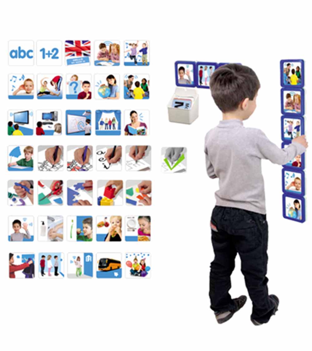 Descripción: Juego elaborado en plástico de alta resistencia y de diferentes colores. Compuesto por 2 Canastas, 10 Marcos azules, 2 Marcos rojos, 12 Bases blancas y 35 Láminas plástica. Cada una con ilustraciones de actividades a realizar en el salón de clases.