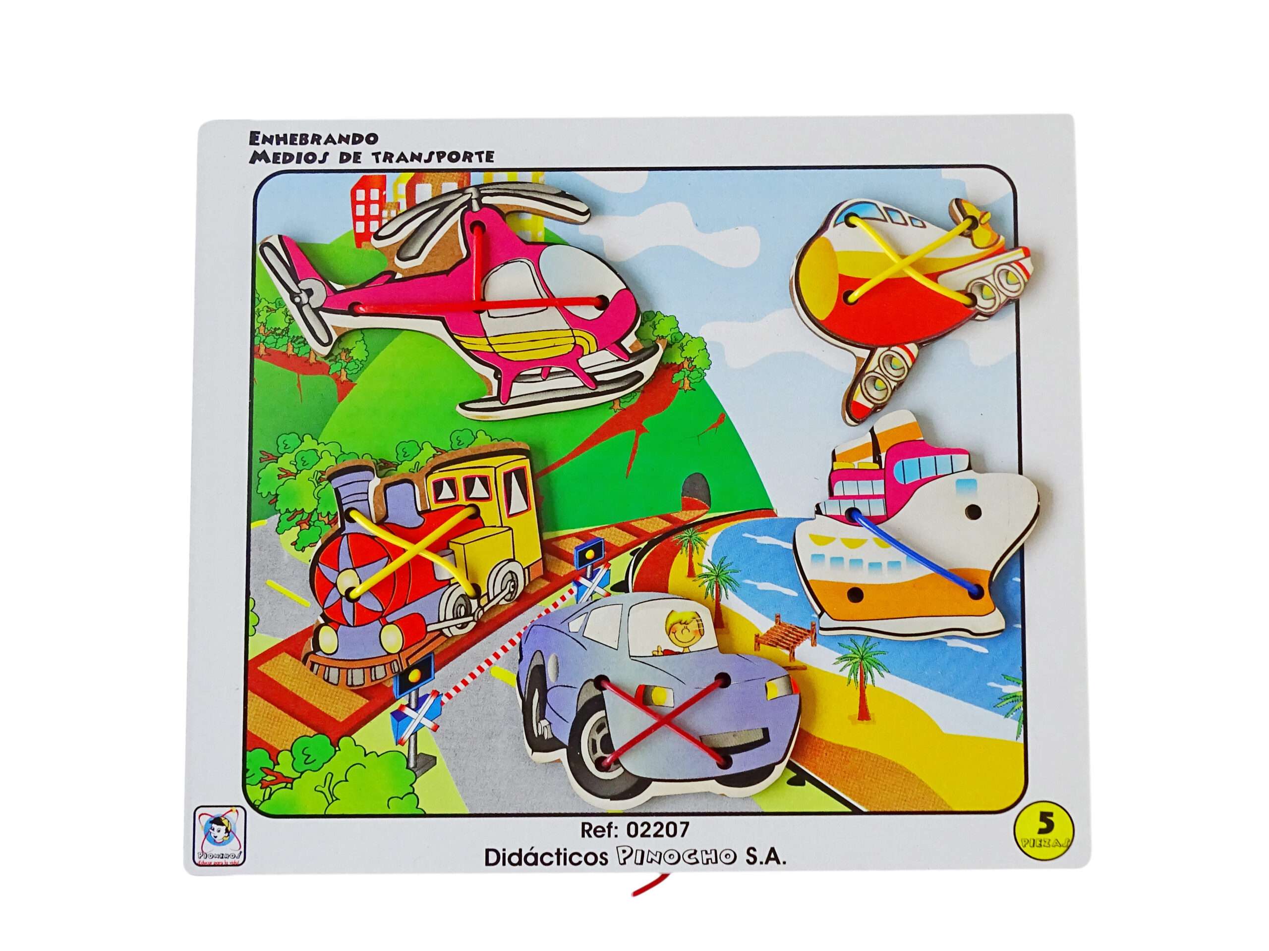 Descripción: Juego fabricado en madera MDF con impresión serigráfica en policromía a base de tintas UV no tóxicas, compuesto por 5 piezas modulares con perforaciones, una base con marco en madera y 5 cordones para enhebrar.