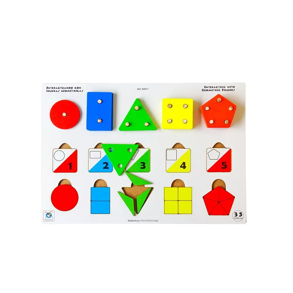 Descripción: Juego fabricado en madera MDF con impresión serigráfica en policromía a base de tintas UV no tóxicas. Compuesto por una base, en la parte superior contiene 5 tipos de figuras geométricas 1 círculo, 2 rectángulos, 3 triángulos, 4 cuadrados y 5 pentágonos, que se insertan sus respectivos ejes, en la parte central 5 cuadrados para extraer y en la parte inferior 5 tipos de figuras geométricas planas extraíbles y divididas en partes de acuerdo a la figura. Contiene un total de 35 fichas.