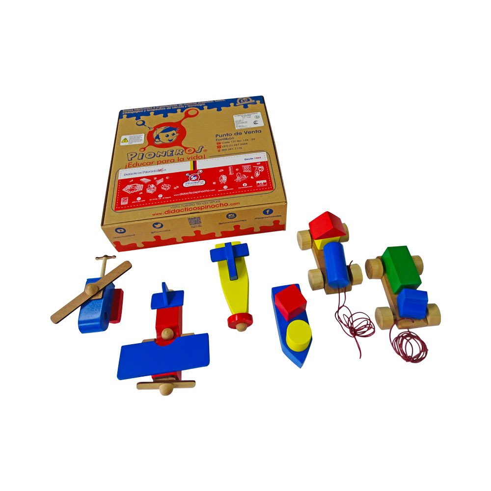Descripción: Juego fabricado en madera MDF y pintado con pinturas no tóxicas, compuesto por 6 figuras representativas de medios de transporte: tren, barco, camión, avión, helicóptero y buque carguero.