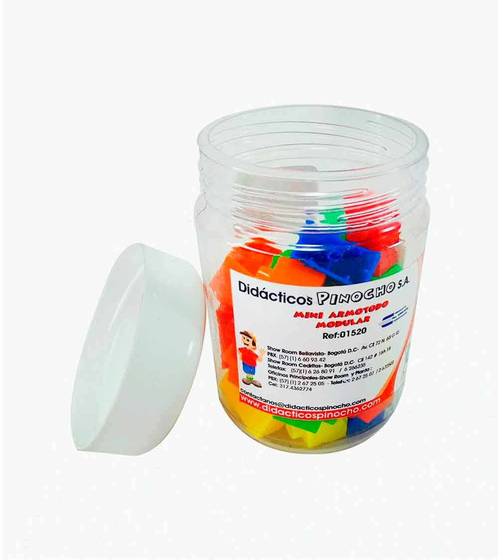 Descripción: Juego elaborado en plástico de diferentes tamaños, formas y colores. Compuesto por 30 piezas con un sistema de unión macho-hembra.