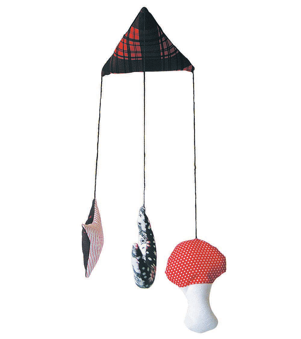 Descripción: Móvil acción y reacción elaborados en espuma y tela de diferentes formas y colores. Compuesto de 4 piezas; colores negro, blanco y negro, una base y tres colgantes (sonoras) las cuales vienen en forma de abejita, sonajero y lunita.