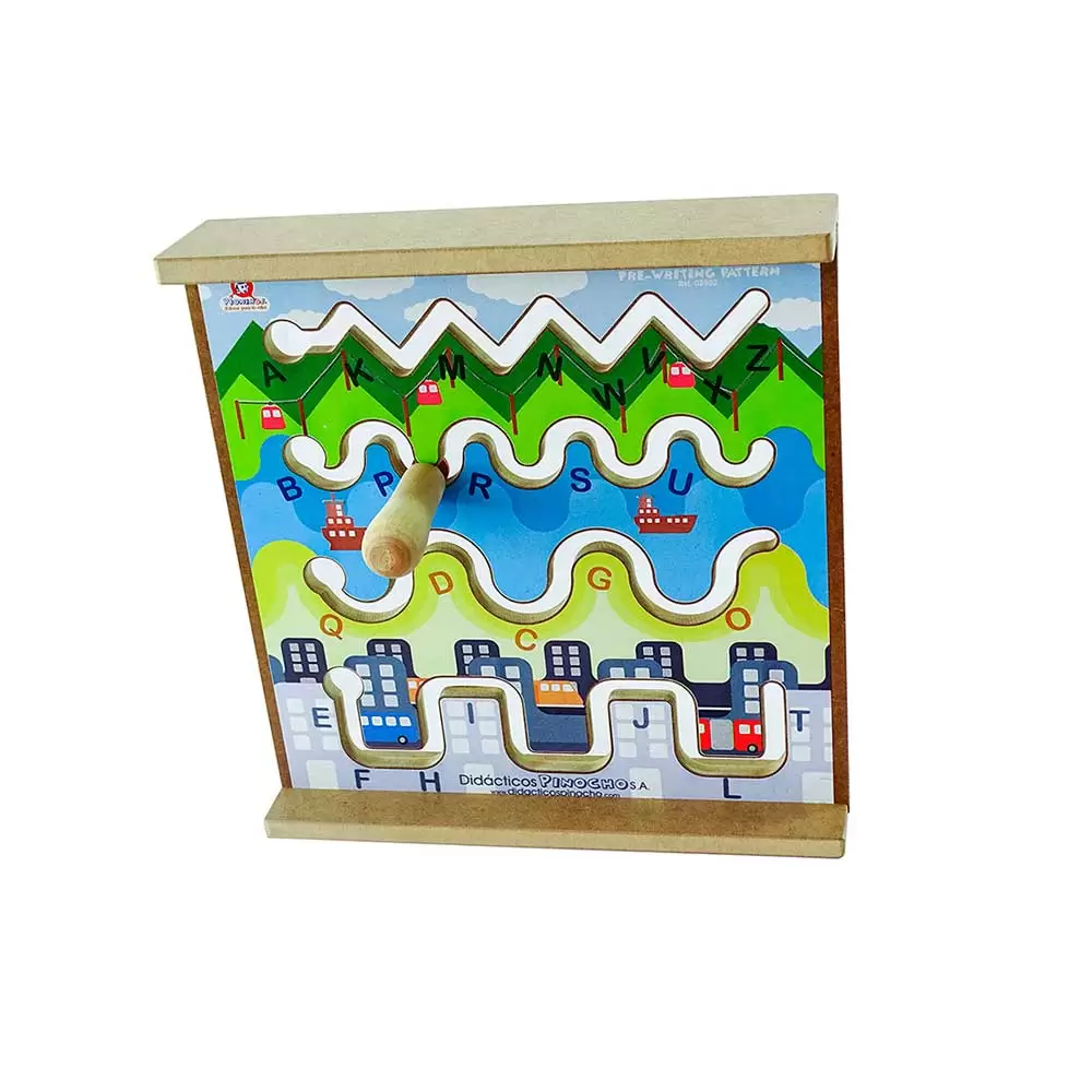 Descripción: Producto fabricado en madera, compuesto por una plantilla vertical en madera MDF con impresión serigráfica a base de tintas UV no tóxicas, 4 patrones distintos. Incluye lápiz de madera perillo de Ø 3 x 10 cm.