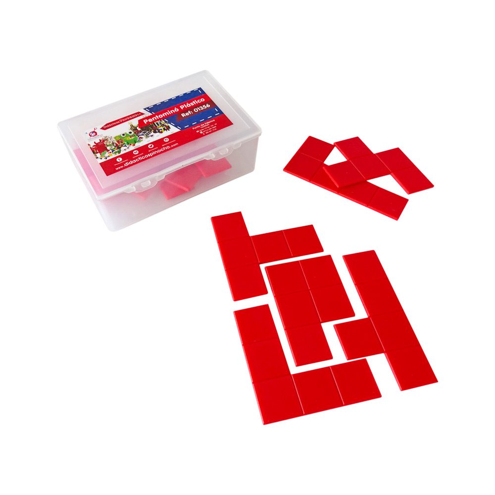 Descripción: Pentomino elaborado en plástico inyectado de color rojo. Compuesto por 12 fichas plásticas bidimensionales formadas por 5 cuadrados de 2,5 cm de lado, dispuestos de diversas maneras.
