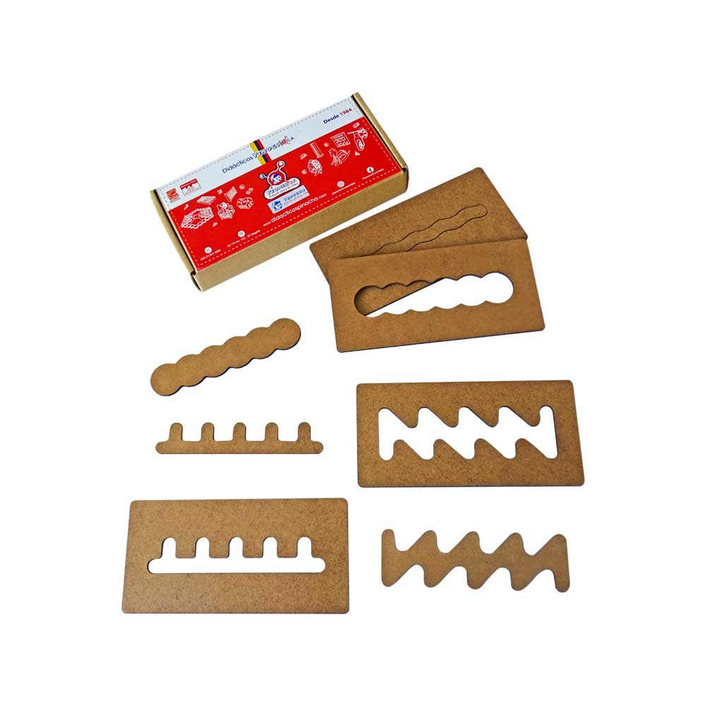 Descripción: Producto fabricado en madera MDF, compuesto por 10 plantillas. Cada una contiene en la parte interna una figura diferente con varios tipos de dificultad.