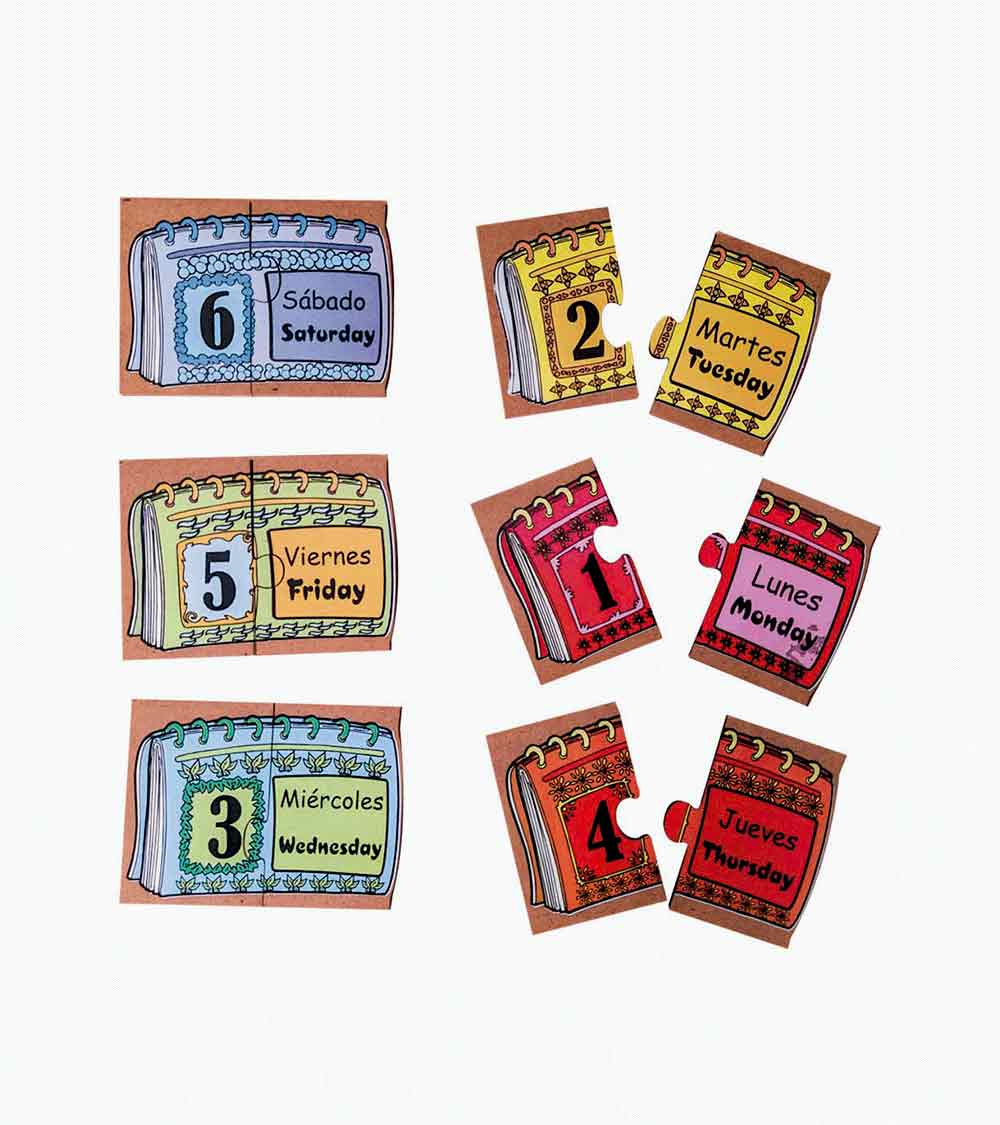 Juego Didáctico – Objetivo: El juego consiste en tomar todas las fichas que conforman el rompecabezas y asociar unas con otras con la finalidad de armar la figura establecida. Esto con el objetivo de desarrollar el aprendizaje y desarrollo de la agilidad mental, la imaginación, la memoria y representa una buena iniciación para la capacidad de resolver problemas. Permite el aprendizaje de los dias de la semana.