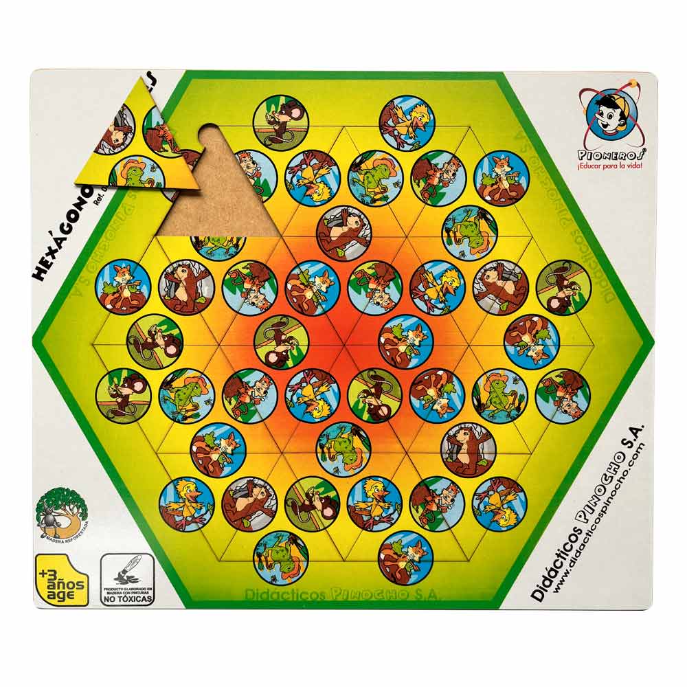 Descripción: Rompecabezas fabricado en madera MDF con impresión serigráfica en policromía a base de tintas UV no tóxicas, compuesto por 24 piezas modulares en forma triangular que conforman hexágonos y una base con marco en madera.