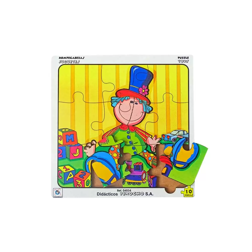 Descripción: Rompecabezas fabricado en madera MDF con impresión serigráfica en policromía a base de tintas UV no tóxicas, compuesto por 10 piezas modulares y una base con marco en madera.