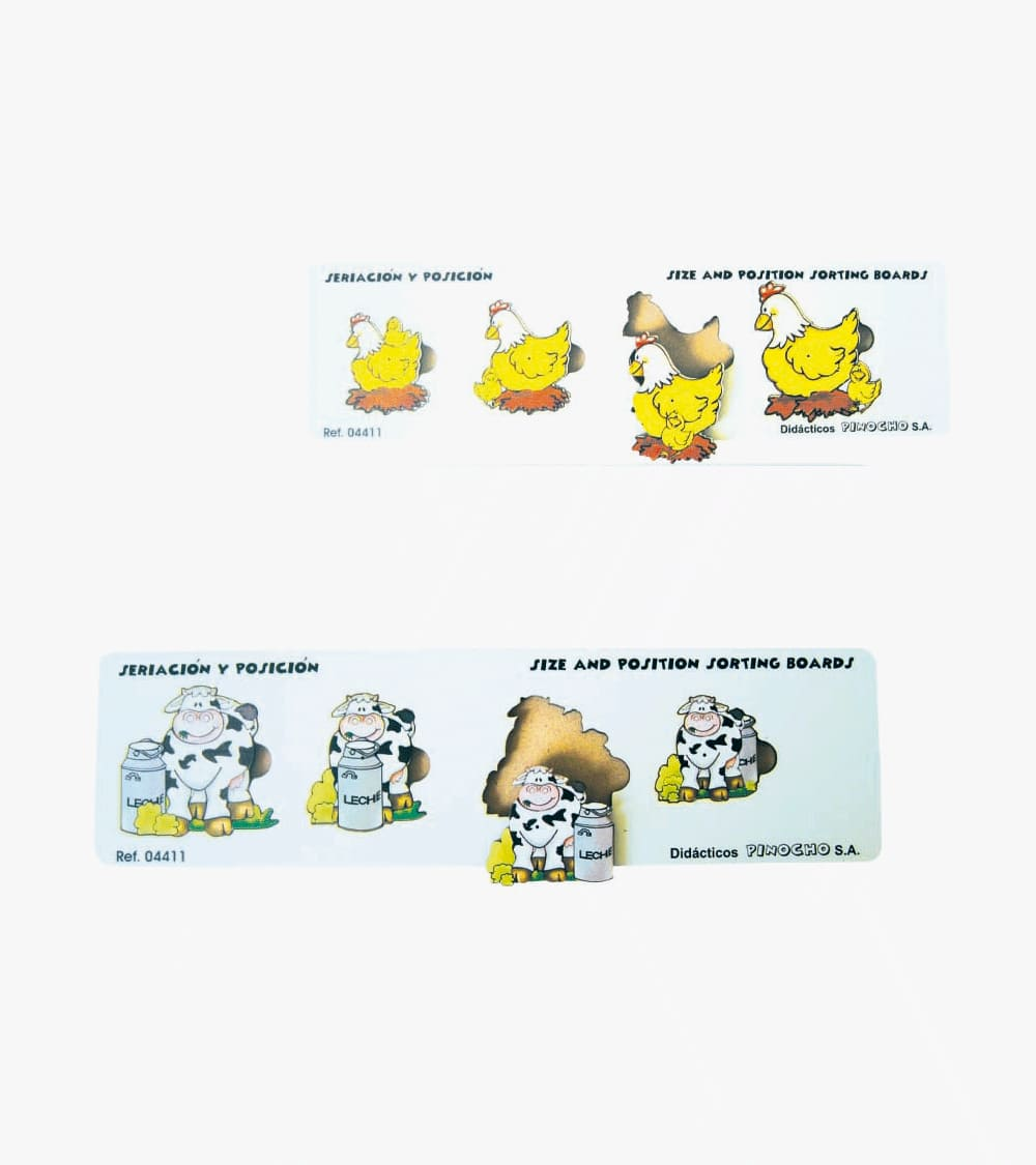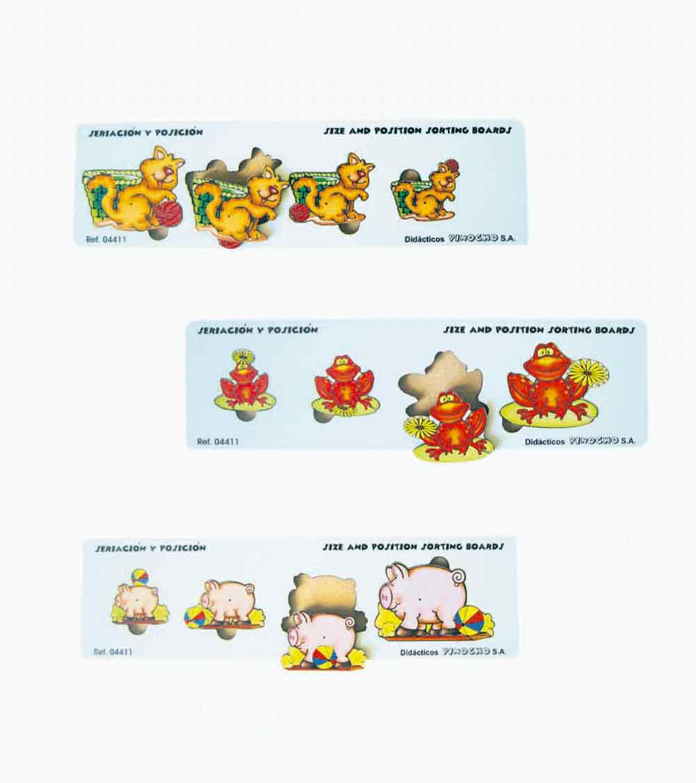 Descripción: Juego elaborado en madera MDF con impresión serigráfica en policromía a base de tintas UV no tóxicas. Compuesto por una plantilla y 4 piezas de un animalito en tamaño seriado. Motivos variados (gato, cerdito, rana, vaca, perro y gallina).