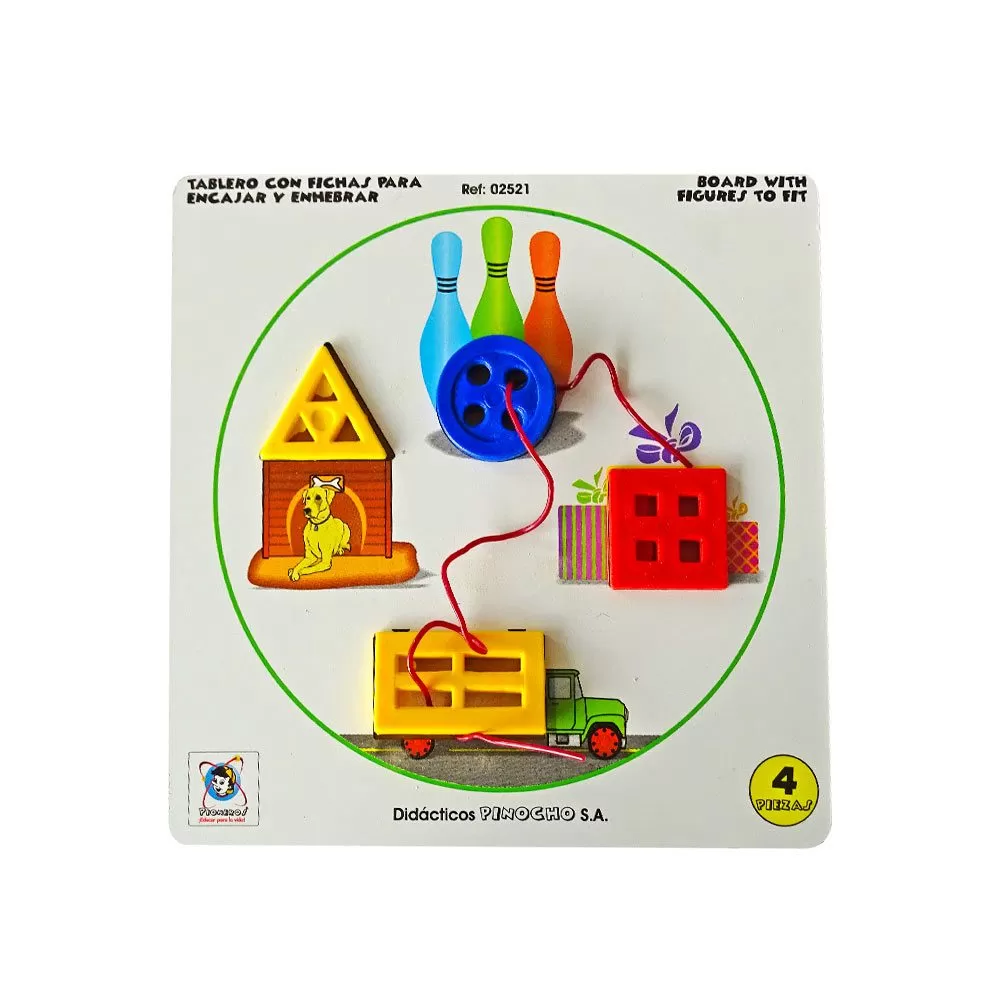 Descripción: Juego fabricado en madera MDF con impresión serigráfica en policromía a base de tintas UV no tóxicas, compuesto por una base cuadrada con 4 vaciados de figuras geométricas que complementan una ilustración, 1 mimbre o cuerda y 4 fichas plásticas para encajar y enhebrar (círculo, cuadrado, triángulo y rectángulo).