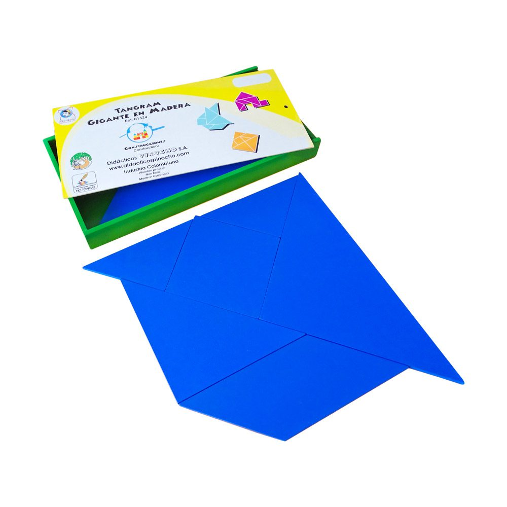 Descripción: Juego fabricado en madera MDF y pintado con pinturas no tóxicas, compuesto por 1 caja de madera que funciona como almacenamiento y 7 figuras geométricas: 2 triángulos grandes, 1 triángulo mediano, 2 triángulos pequeños, 1 cuadrado y 1 romboide. El tangram forma un cuadrado de 49 x 49 x 0,9 cm.
