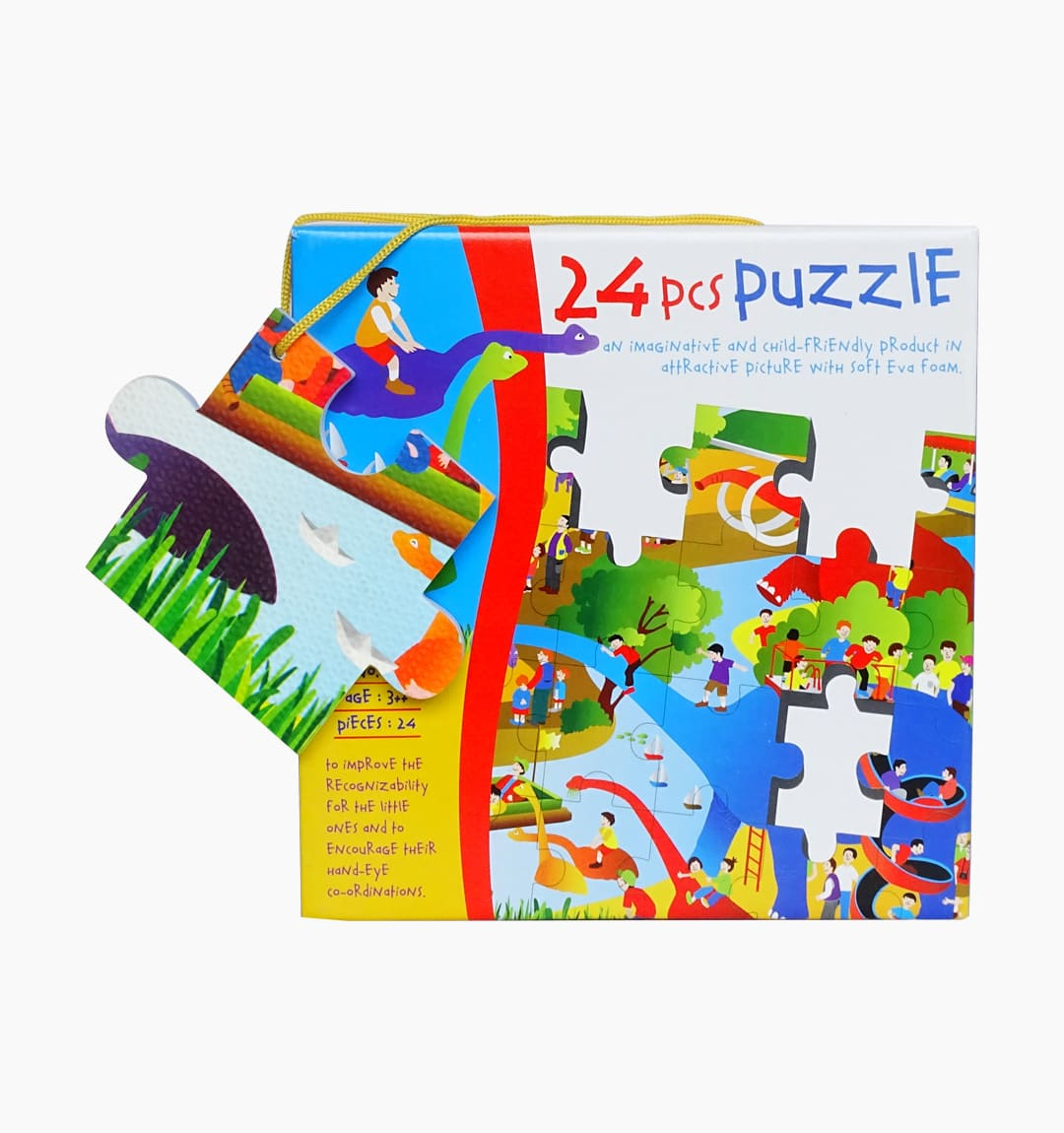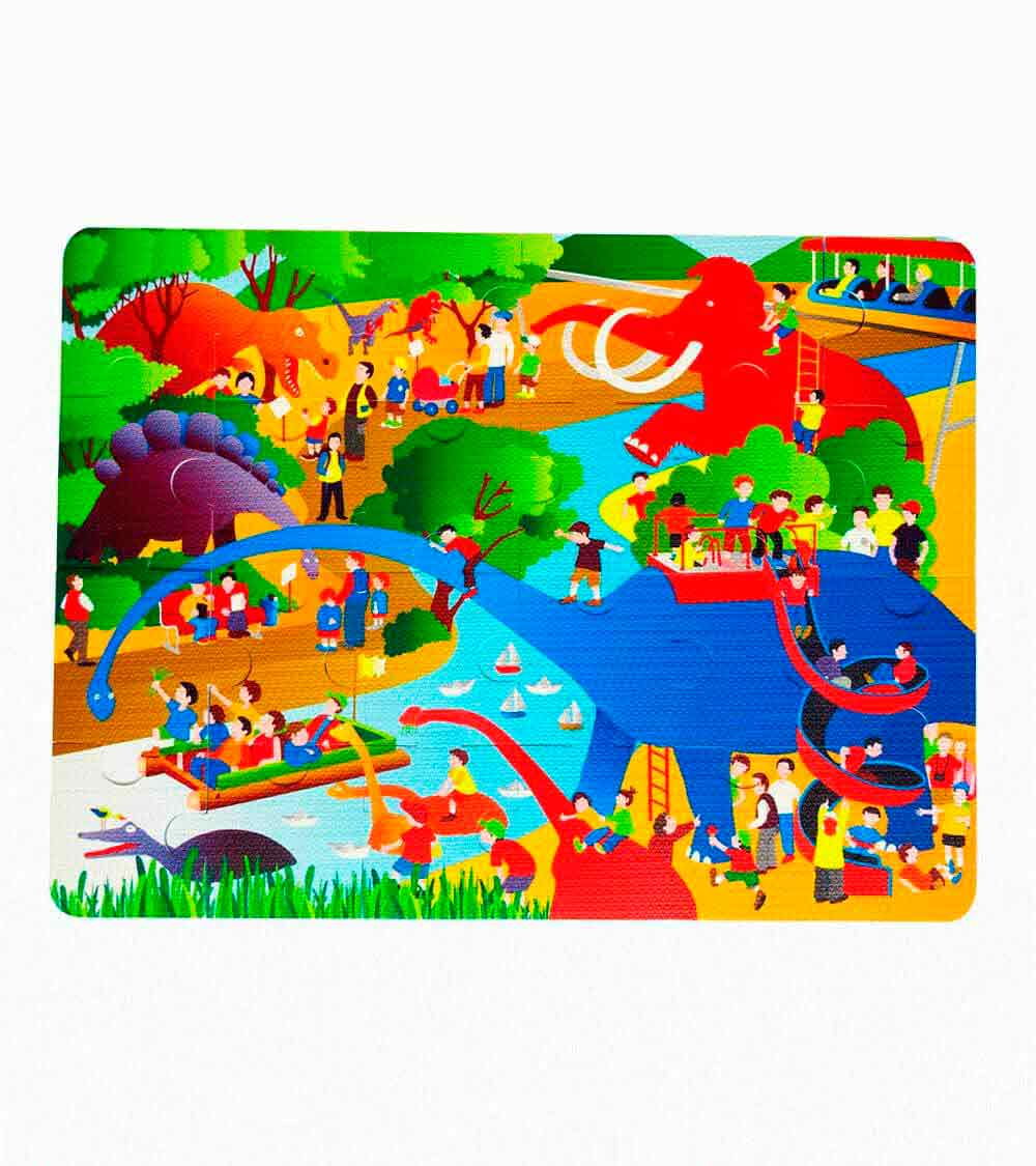 Descripción: Tapete rompecabezas parque prehistórico elaborado en Eva con impresión sobre rígido resistente (policromía). Contiene 24 piezas y cada una tiene un sistema de uniones tipo rompecabezas (32×32 cm). Resistente al agua y de facil limpieza.