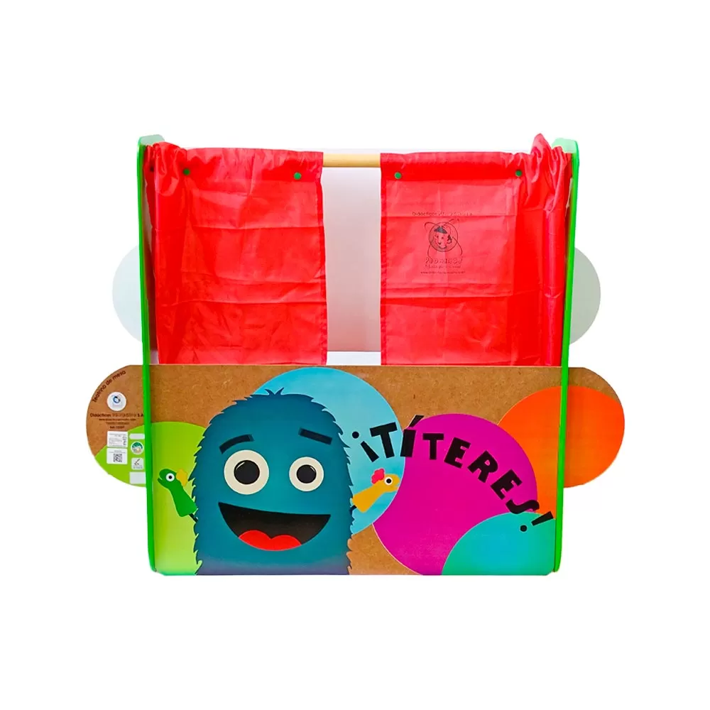 Descripción: Producto fabricado en madera MDF y perillo con impresión serigráfica en policromía a base de tintas UV no tóxicas, compuesto por 1 módulo frontal de 87 x 35 x 0,3 cm, 1 módulo posterior de 87 x 35 x 0,3 cm, 2 laterales de 50 x 70 x 0,4 cm, 1 bolillo en madera de Ø 1,5 x 69 cm y 2 cortinas en tela.